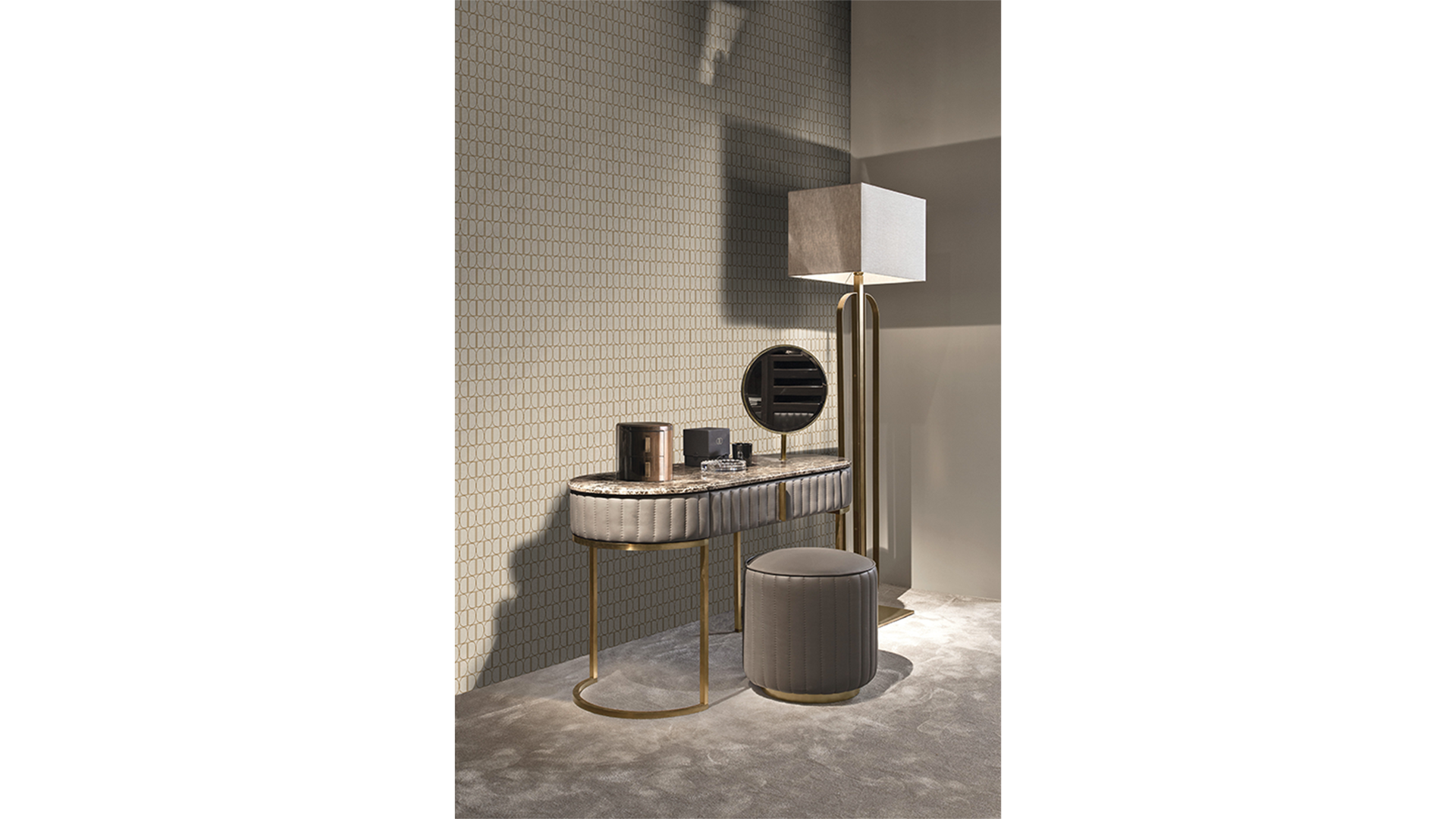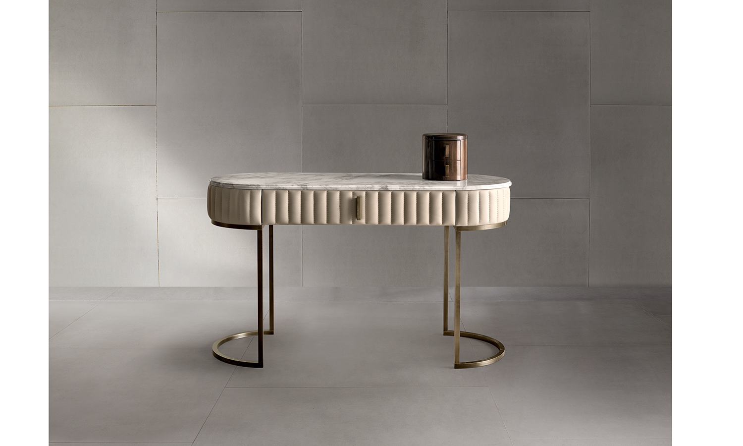 Фанерна конструкція, висувні ящики з тканиною з м’якими металевими бігунками. Фасади ящиків стьобані з мотивом каннетте. Основа та ручки з полірованої латуні. Мармуровий верх.Характеристики