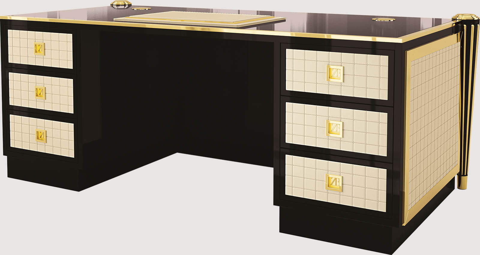 Масив дерева, фанера та МДФ каркас. Лакований дерев'яний верх. Зовнішній корпус та ящики зі стьобаної шкіри, з металевими деталями. Дерев’яні та латунні ніжки. Доступний з одним або двома кабельними органайзерами. Шкіряна накладка для письмового столу за запитом.Характеристики
