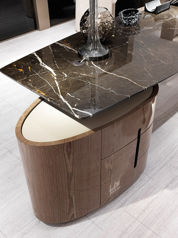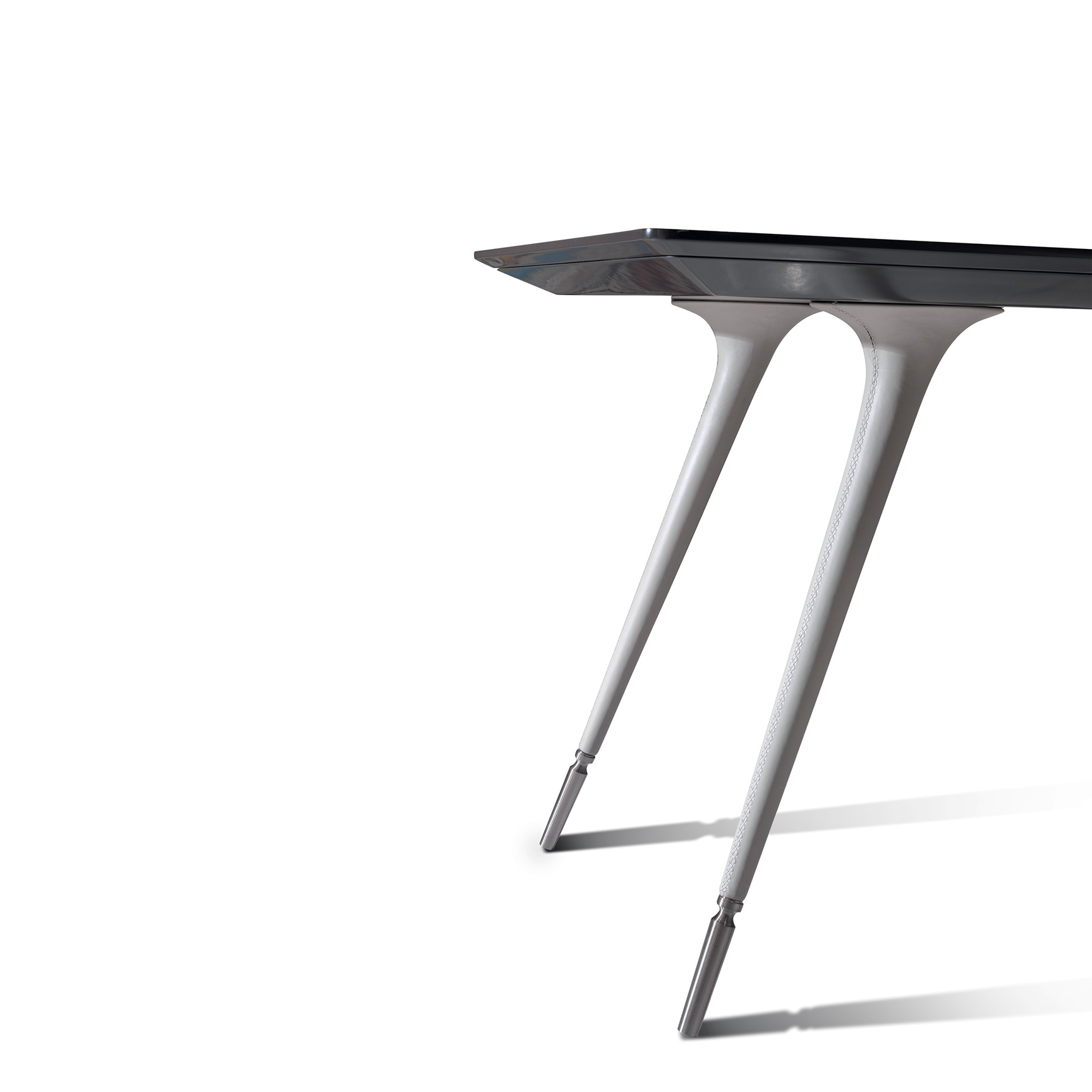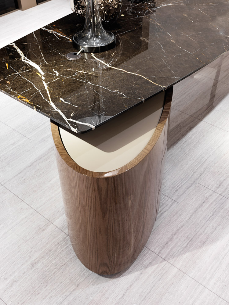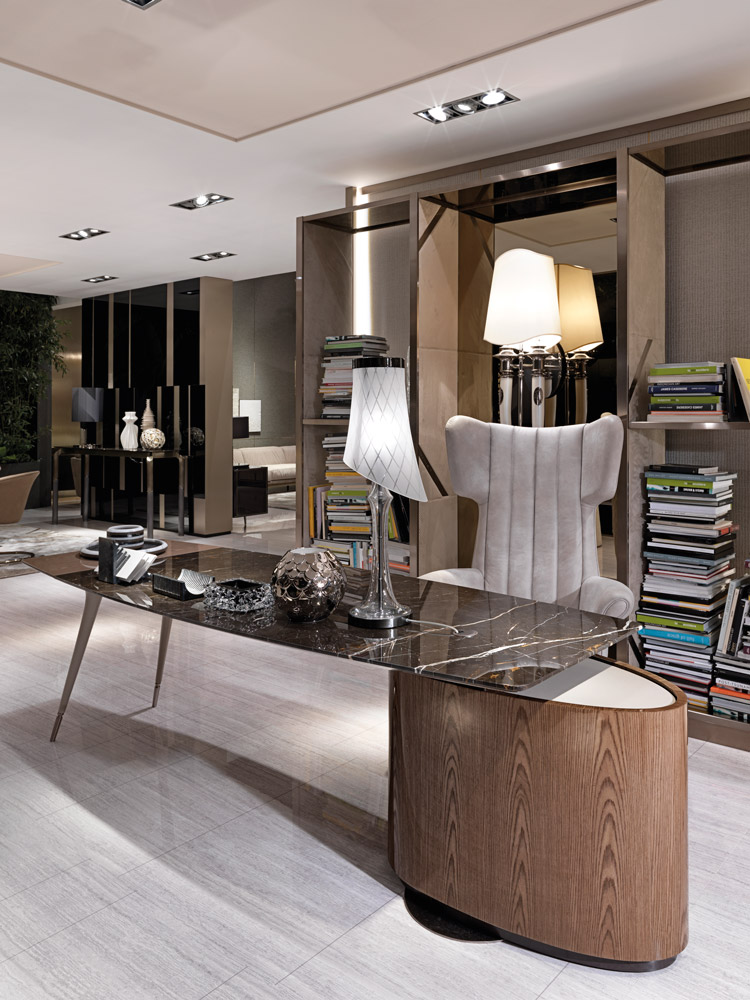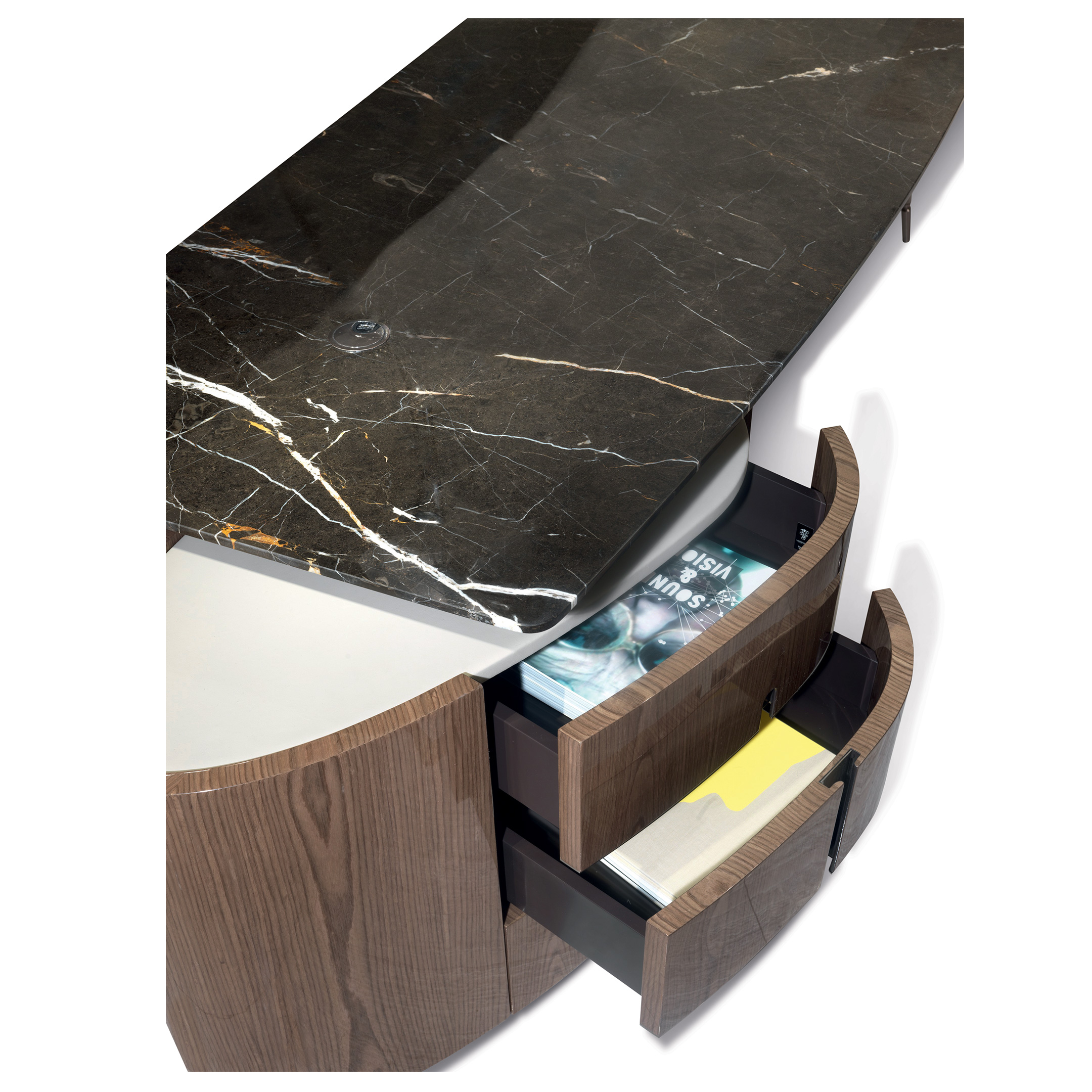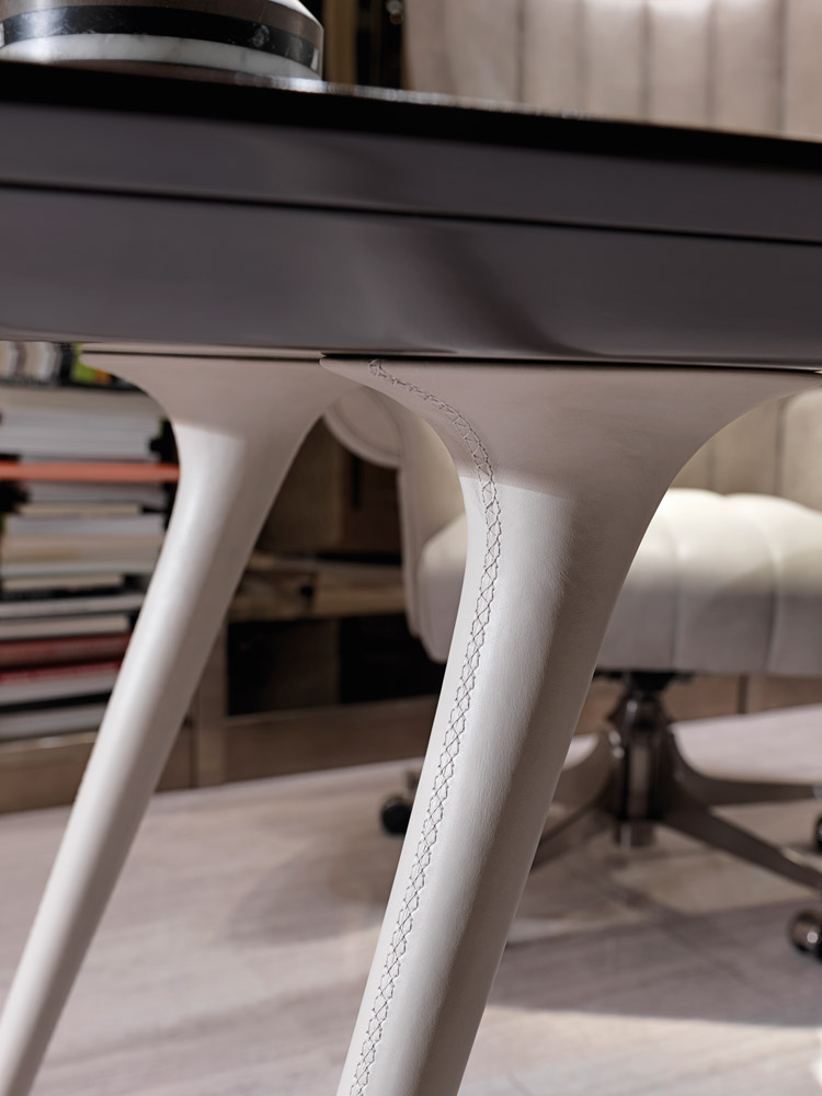 Письмовий стіл з дерева та мармуру з регульованим висувним блоком. Структура висувного ящика з вигнутої фанери, покритої шпоном або лаками (кольори RAL), з 3 ящиками Внутрішня ніжка та профілі ящиків із сатинованої нержавіючої сталі. Верх у 2 шари з лакованого дерева та фасонного мармуру, з “негативним” виготовленням по краю, кабельним виводом, торцевою частиною верху з дерева, покритого шпоном або лакованим (кольори RAL). Бічні ніжки з дерева у формі «каблука», обтягнуті вручну шкірою, з наконечниками з сатинованої нержавіючої сталі. Шпоновані деталі доступні в обробці шпону. Металеві деталі доступні у виборі сатинованого металу.Характеристики