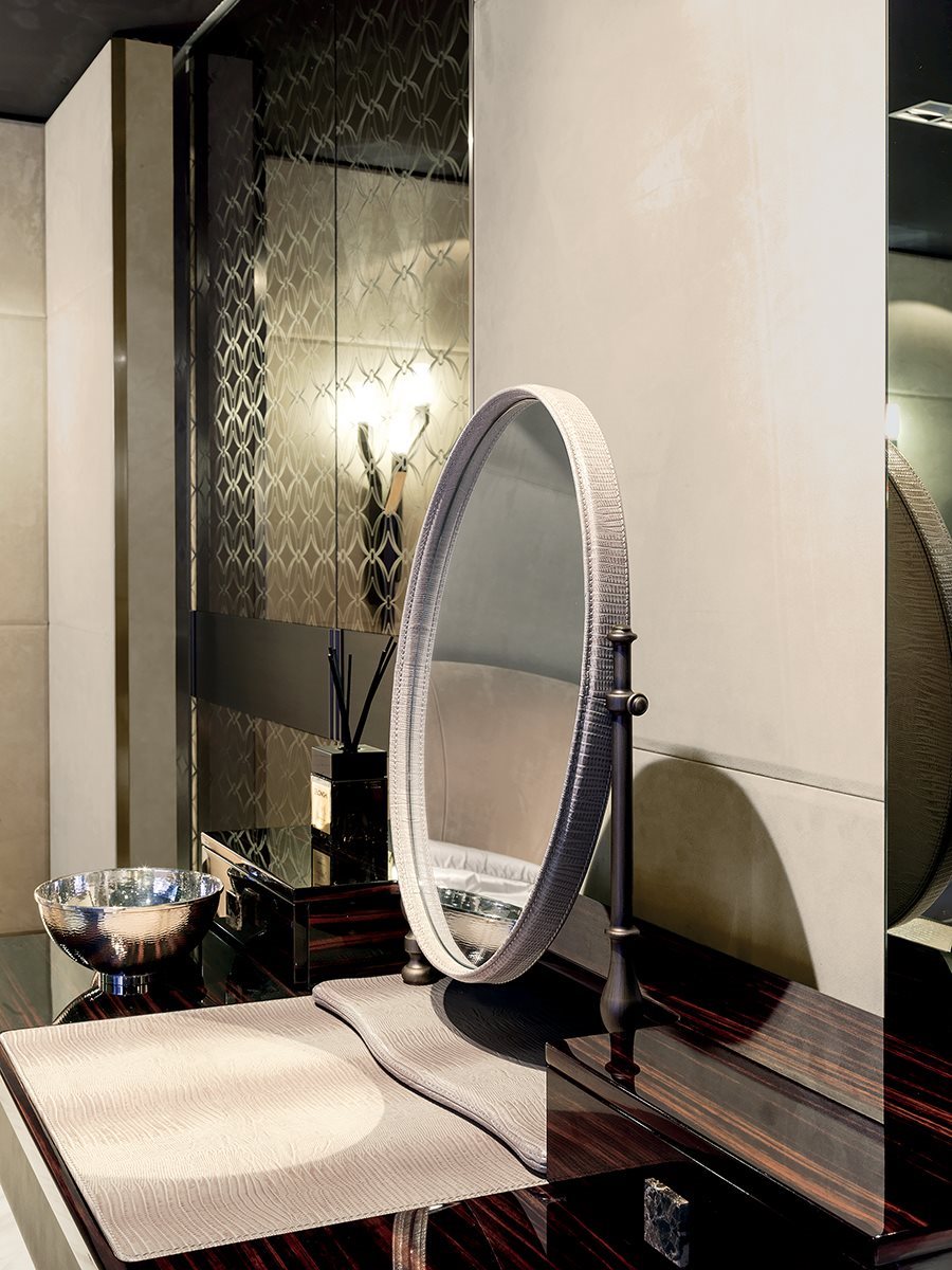 Стіл для макіяжу з дерева у фінішній обробці: - глянцеве лаковане дерево різноманітних кольорів, - глянцеве / матове чорне дерево, - глянсове / матове волоське горіх Каналетто, - глянсове / матове фрісе з явору. Дзеркальна рама та основа оброблені шкірою з каталогу, а точена металева конструкція поставляється в обробці: - золото чорної троянди, - яскраво затінене коричневе, яскраве світле золото, - матове шампанське золото, - яскравий хром, - яскравий чорний хром , - матова атласна бронза, - яскраво-рожеве золото, - матове рожеве золото. Ручки з мармуру або шкіри.Характеристики