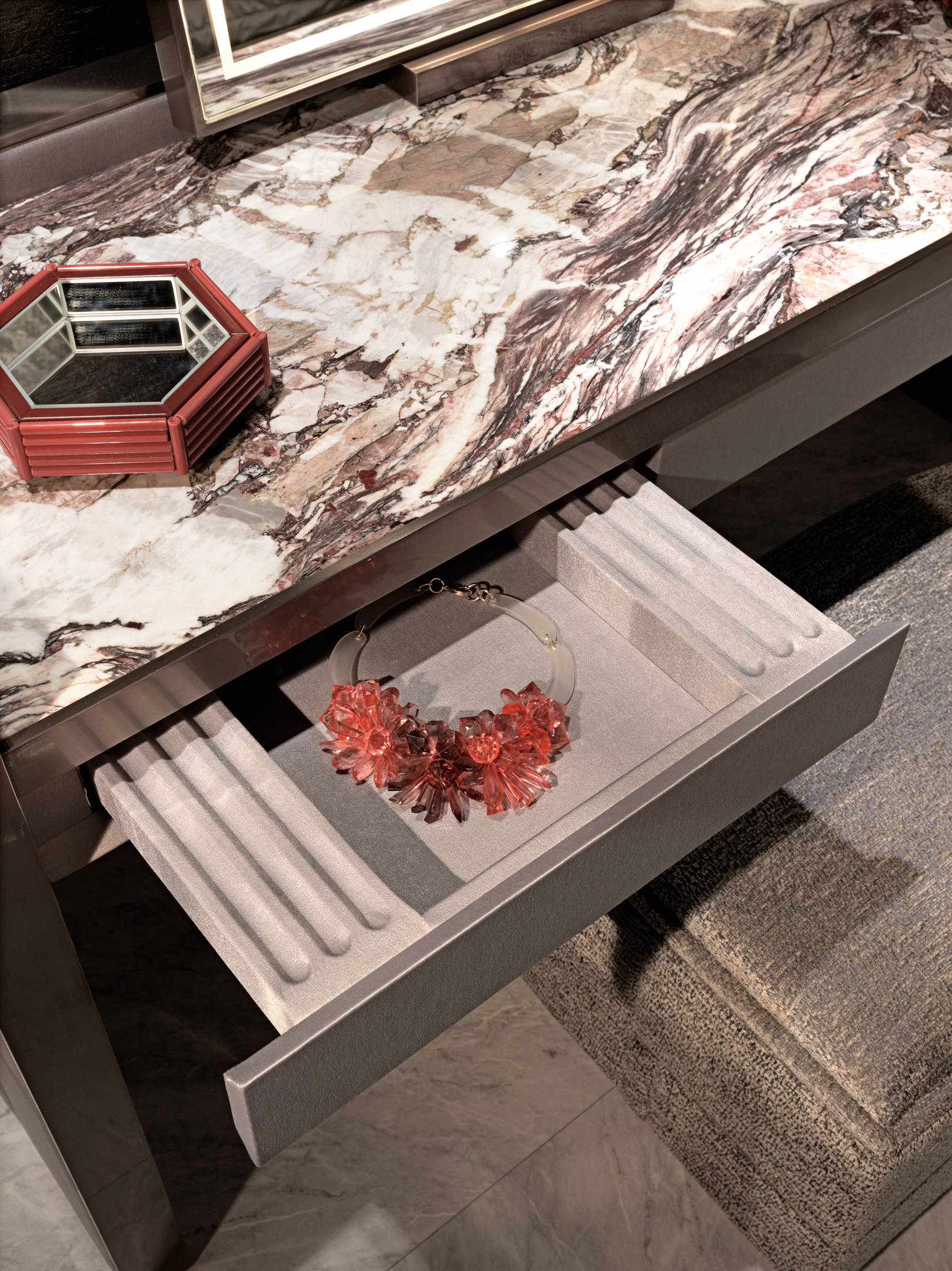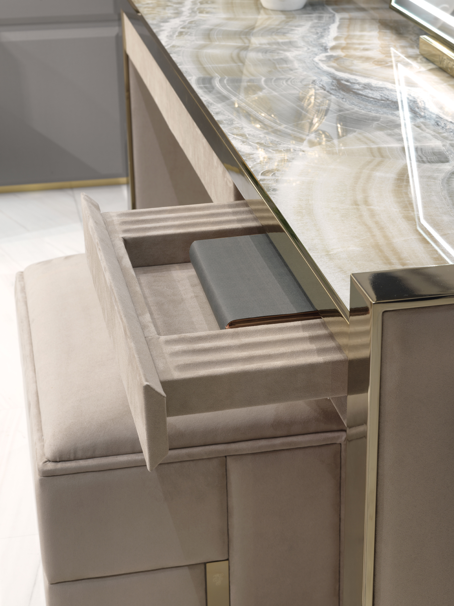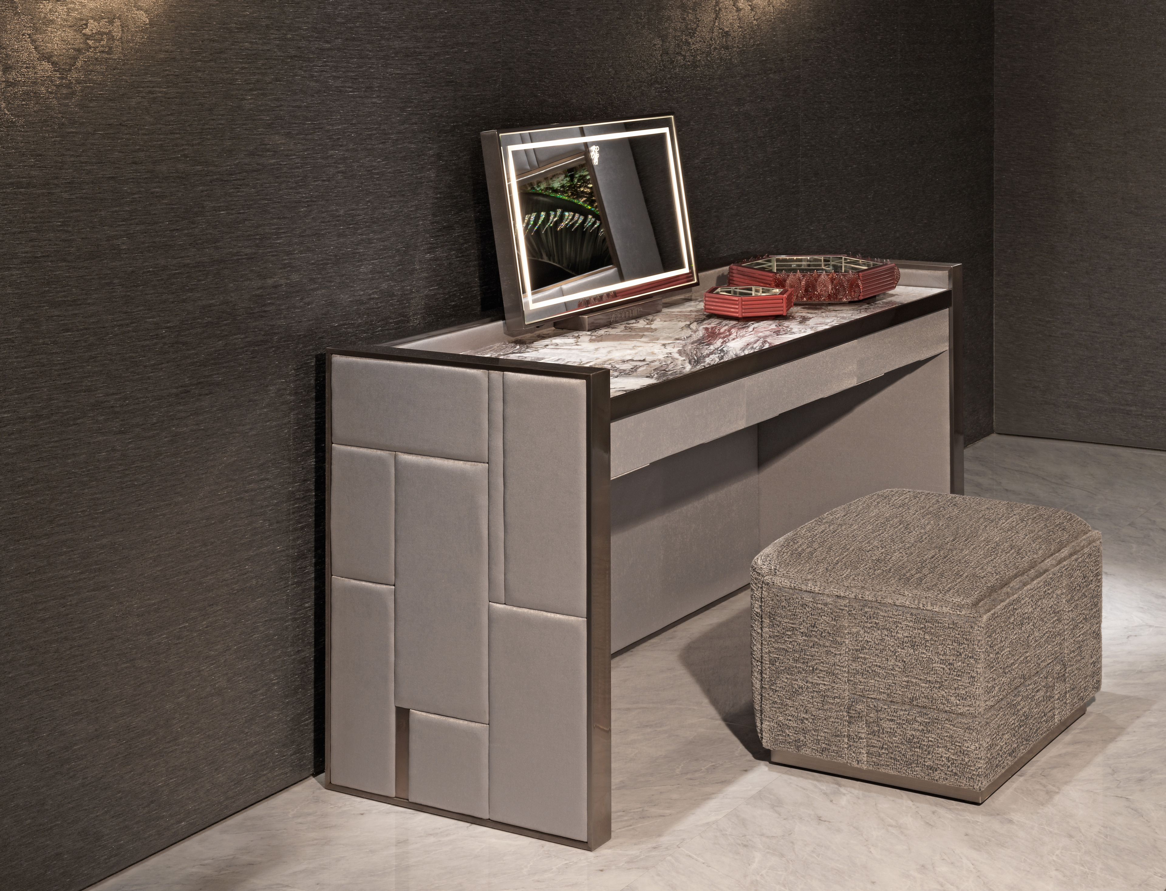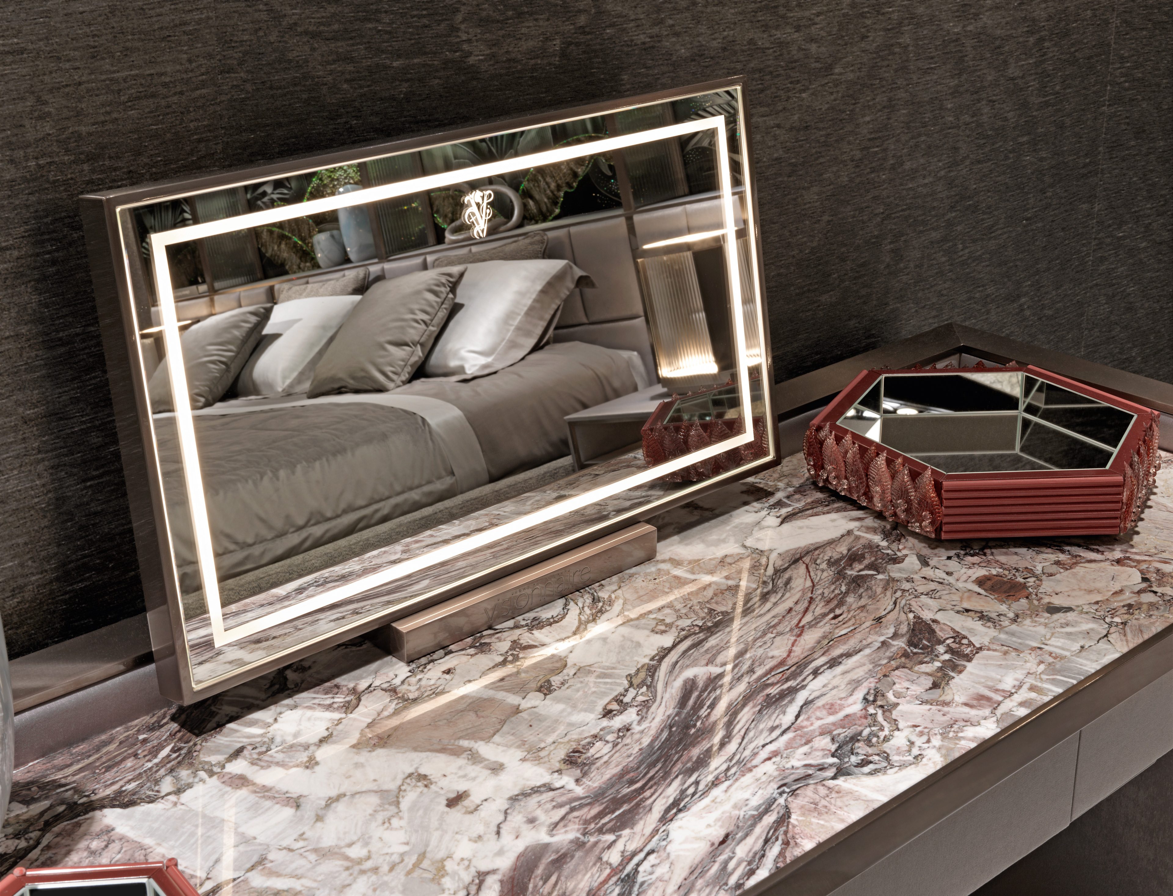 Основна конструкція в сталевій суцільній трубі 60х10 мм, хромована або золота обробка. Внутрішнє покриття з фанерних панелей, оббите та оббите шкірою або тканиною. Зовнішня оббивка бортів шкірою або тканиною, декорована індивідуально оббитими панелями, що створюють геометричний малюнок, з декоративними вставками з сатинованої сталі та гравірованим логотипом. Вбудований мармуровий верх, оснащений 3 м’якими ящиками. Верхнє дзеркало з периметральним профілем у сталі; сатинована рама та герб Visionnaire із світлодіодною системою підсвічування. Металеві деталі можуть бути лаковані в будь-який колір, що входить до вибору металевої обробки.Характеристики