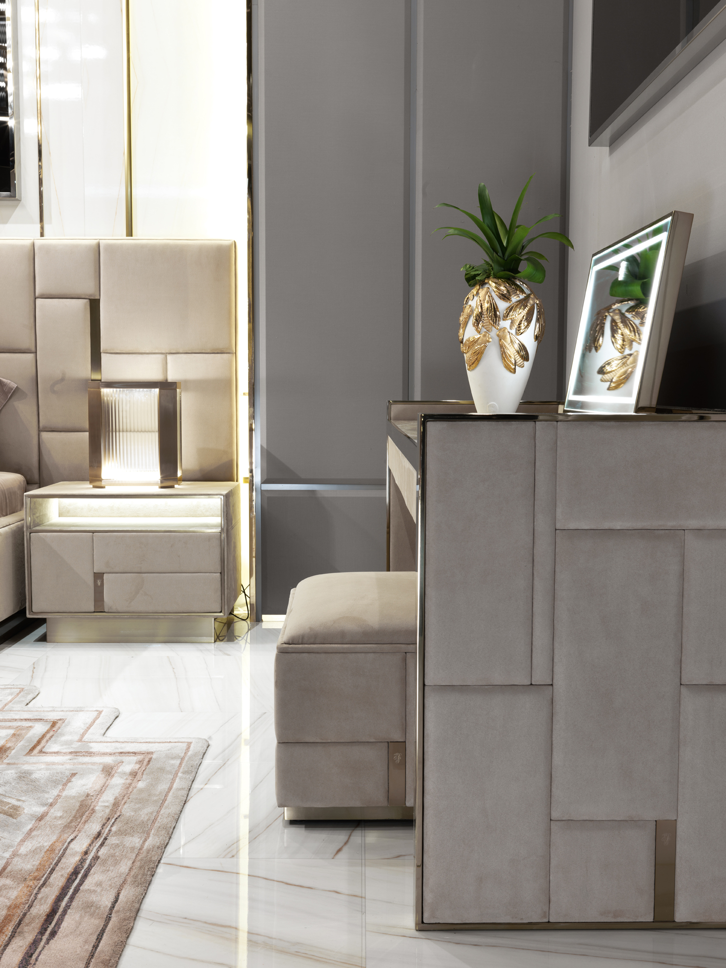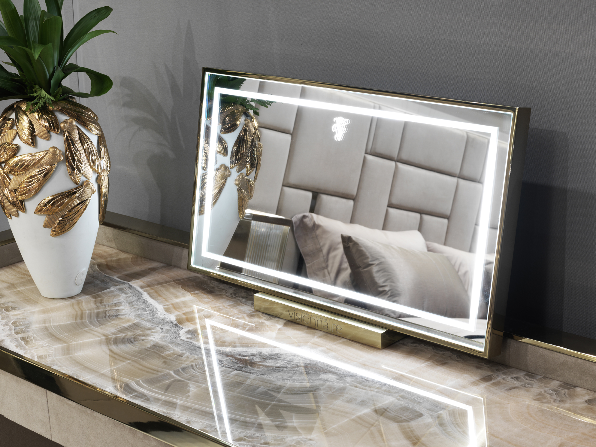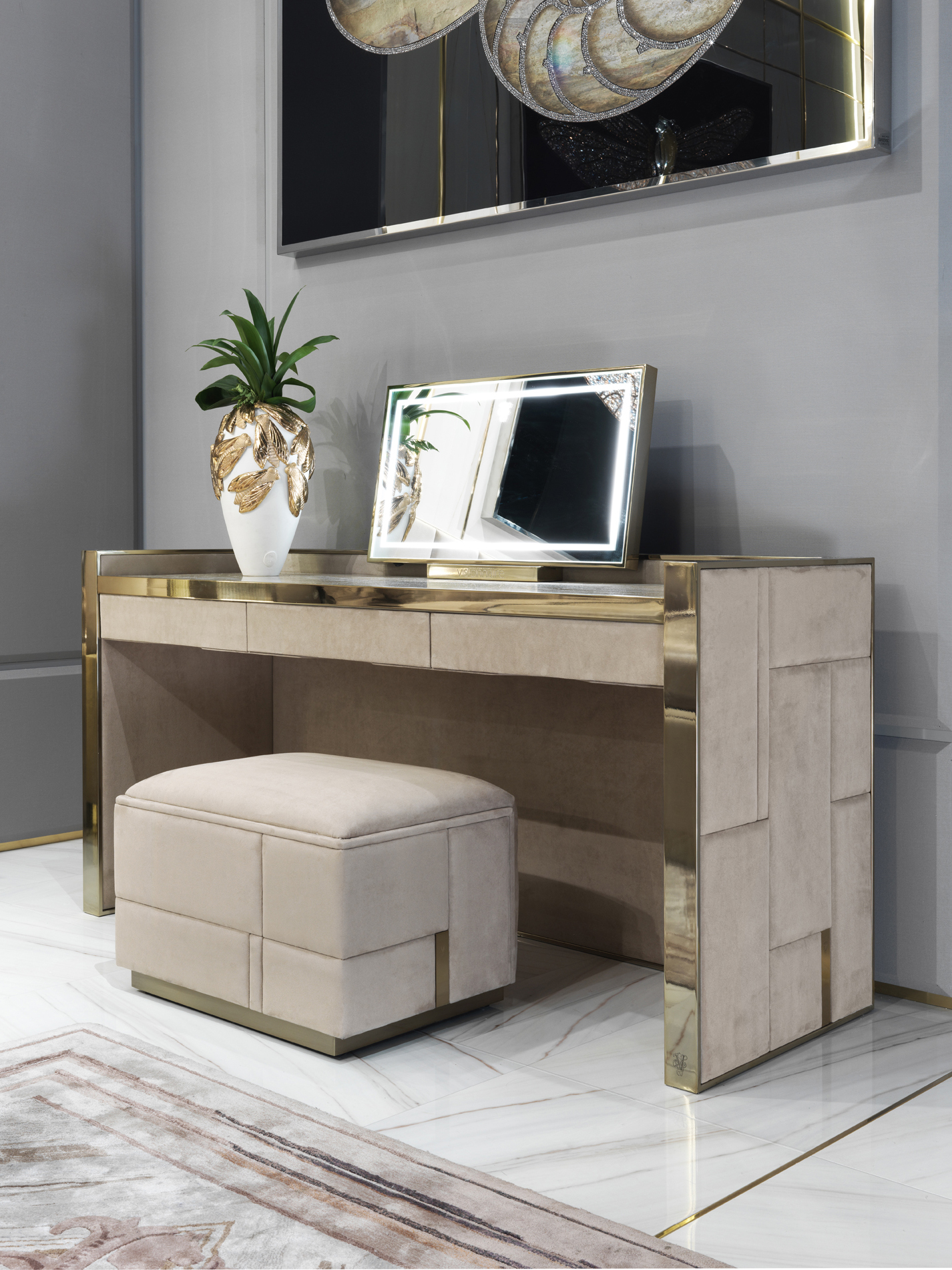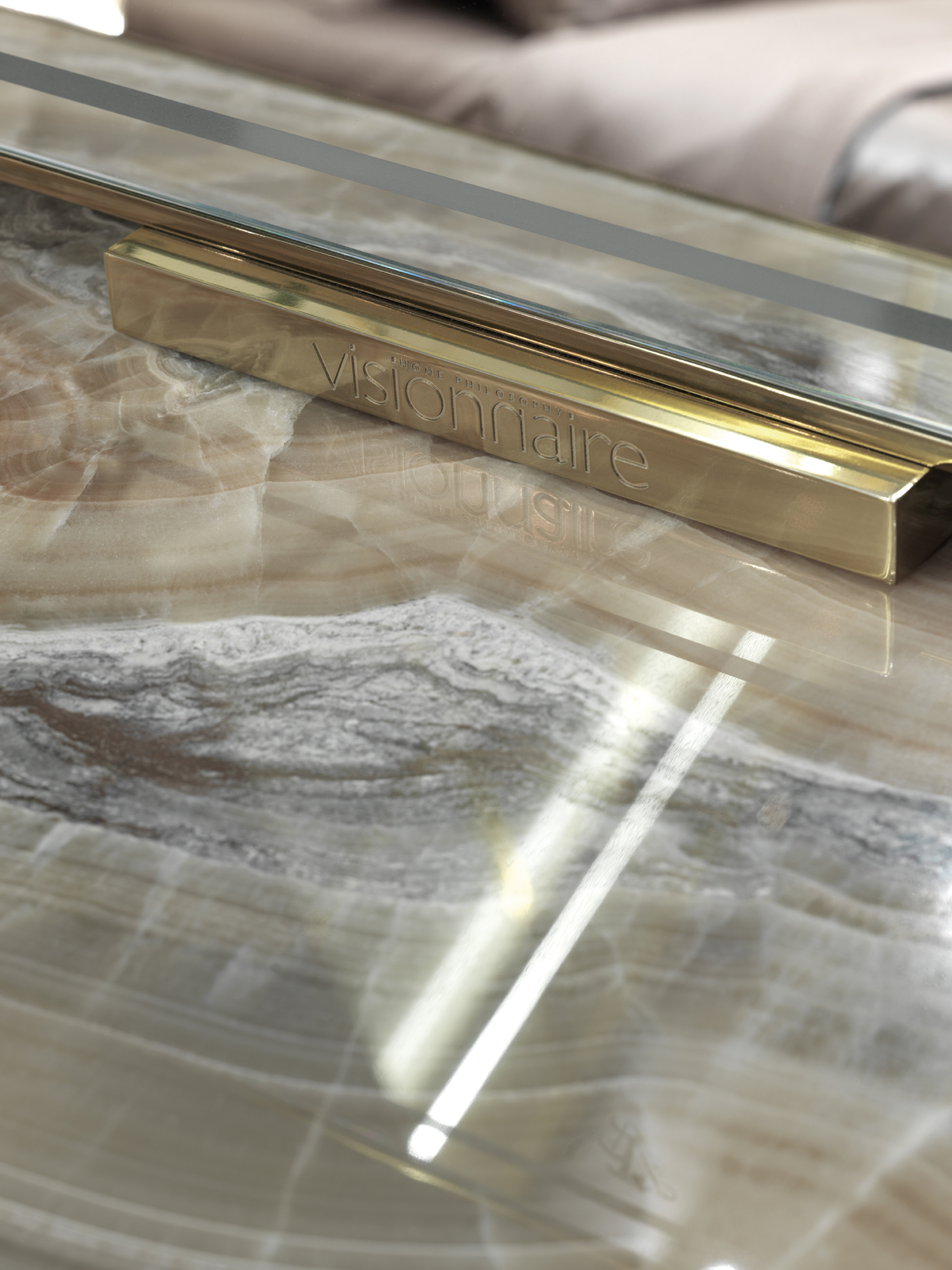 Основна конструкція в сталевій суцільній трубі 60х10 мм, хромована або золота обробка. Внутрішнє покриття з фанерних панелей, оббите та оббите шкірою або тканиною. Зовнішня оббивка бортів шкірою або тканиною, декорована індивідуально оббитими панелями, що створюють геометричний малюнок, з декоративними вставками з сатинованої сталі та гравірованим логотипом. Вбудований мармуровий верх, оснащений 3 м’якими ящиками. Верхнє дзеркало з периметральним профілем у сталі; сатинована рама та герб Visionnaire із світлодіодною системою підсвічування. Металеві деталі можуть бути лаковані в будь-який колір, що входить до вибору металевої обробки.Характеристики