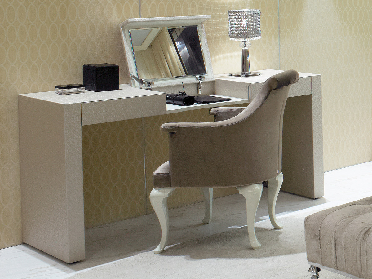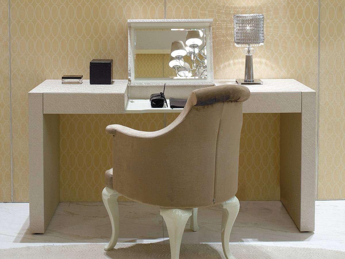 Структура в стільниковій фанері з панелями в МДФ. Центральний верх з отвором компаса, забезпечений внутрішнім дзеркалом зі скошеною облямівкою. Дві шухляди зібрані на інтегрованих бігунках для керованого закриття. Внутрішні висувні ящики та центральний відсік у матовій лакованій обробці. Конструкція повністю оббита тканиною або шкірою.Характеристики