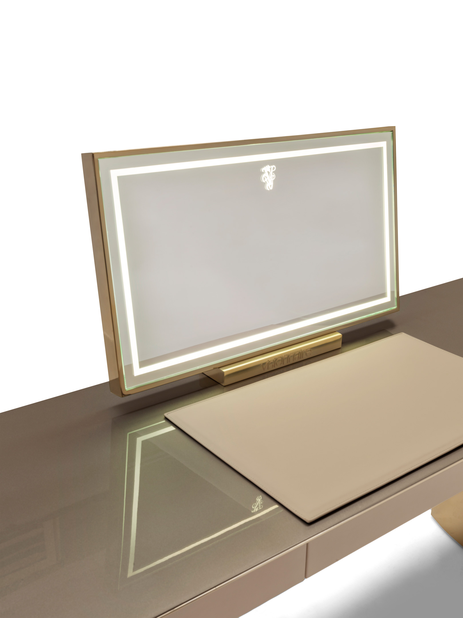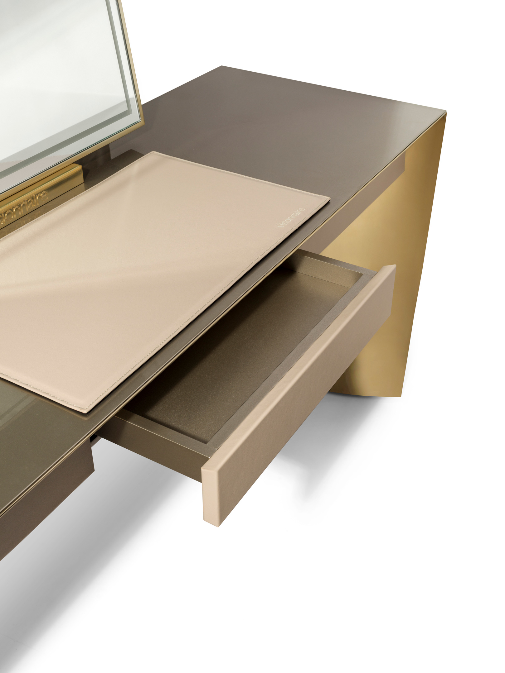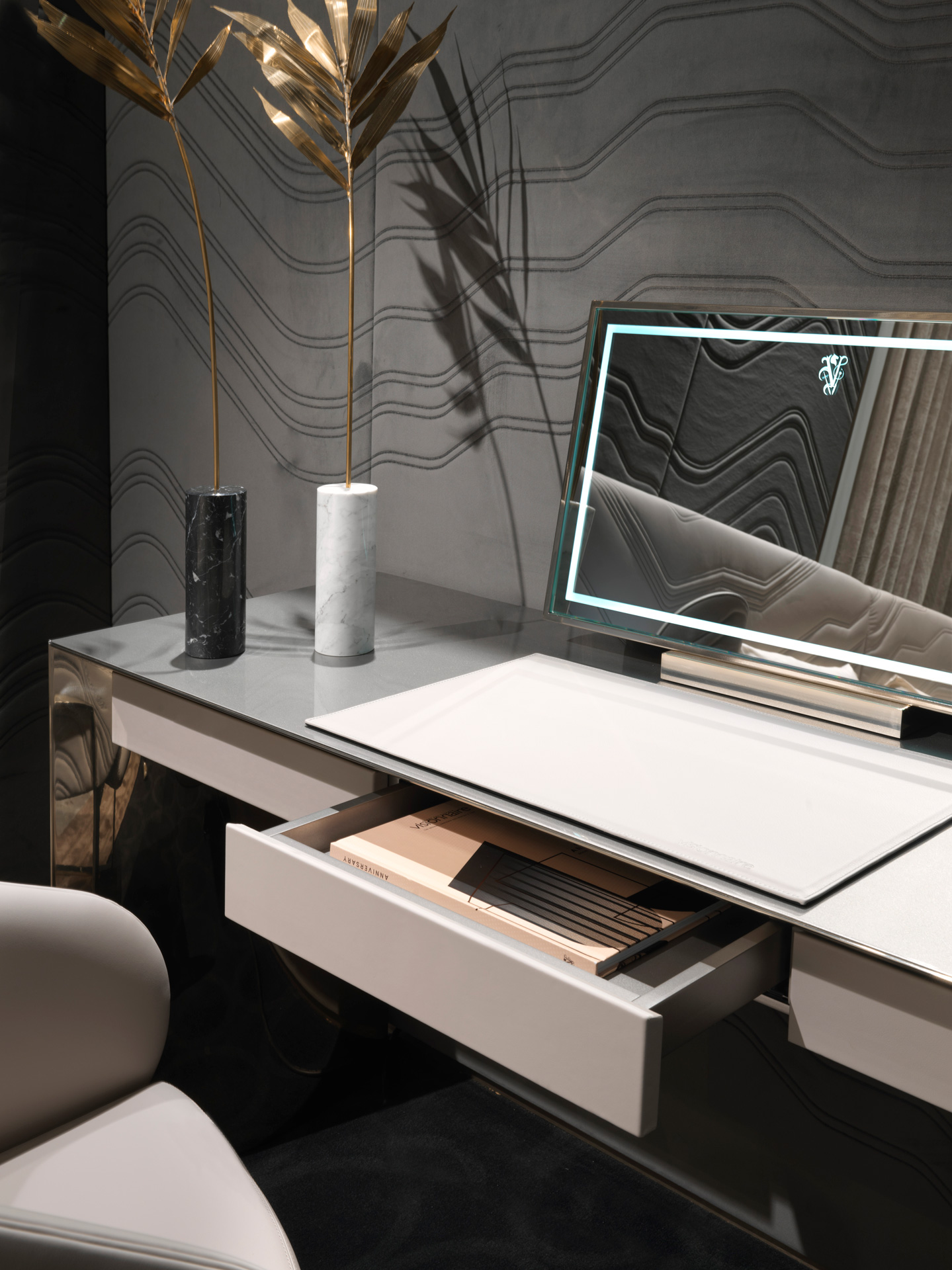 Макіяжний стіл з трьома шухлядами, зовнішня структура в полірованому лакованому дереві. Внутрішня рама з боків і зверху покрита вигнутою полірованою нержавіючою сталлю. Фасади висувних ящиків оббиті шкірою або тканиною, внутрішньо килимовим лаком. Підкладка зі шкіри. Вбудоване дзеркало з рамою з нержавіючої сталі та периметром з підсвічуванням зі світлодіодними ліхтарями. Доступні сталеві деталі з будь-яким покриттям, що входить до вибору полірованого металу.Характеристики
