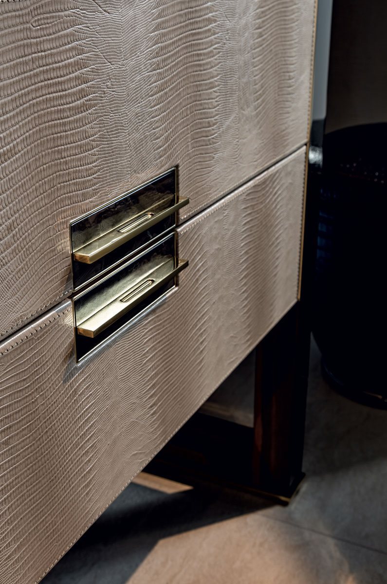 Комод для макіяжу з 2 висувними ящиками та функціональною зоною для зберігання косметики та ювелірних виробів. Основа та верх у дерев’яній обробці: глянцеве лаковане дерево в кольорах діапазону, глянцеве / матове чорне дерево, глянсове / матове волоське горіх Canaletto, глянсове / матове фрісе з явору. Бічні та фасадні ящики, оббиті шкірою з каталогу. Внутрішня частина косметичного контейнера покрита P.3 Cat. Замшева шкіра та закриття дверцят оснащені дзеркалом з металевими краями. Основний металевий профіль та рама виконані в наступних обробках: яскраво-затінене коричневе, яскраве світле золото, матове шампанське золото, яскравий хром, яскраво-чорний хром, матова атласна бронза, яскраво-рожеве золото, матове рожеве золото, золото Black Rose. Ручка з мармуровою вставкою (мармур з асортименту).Характеристики