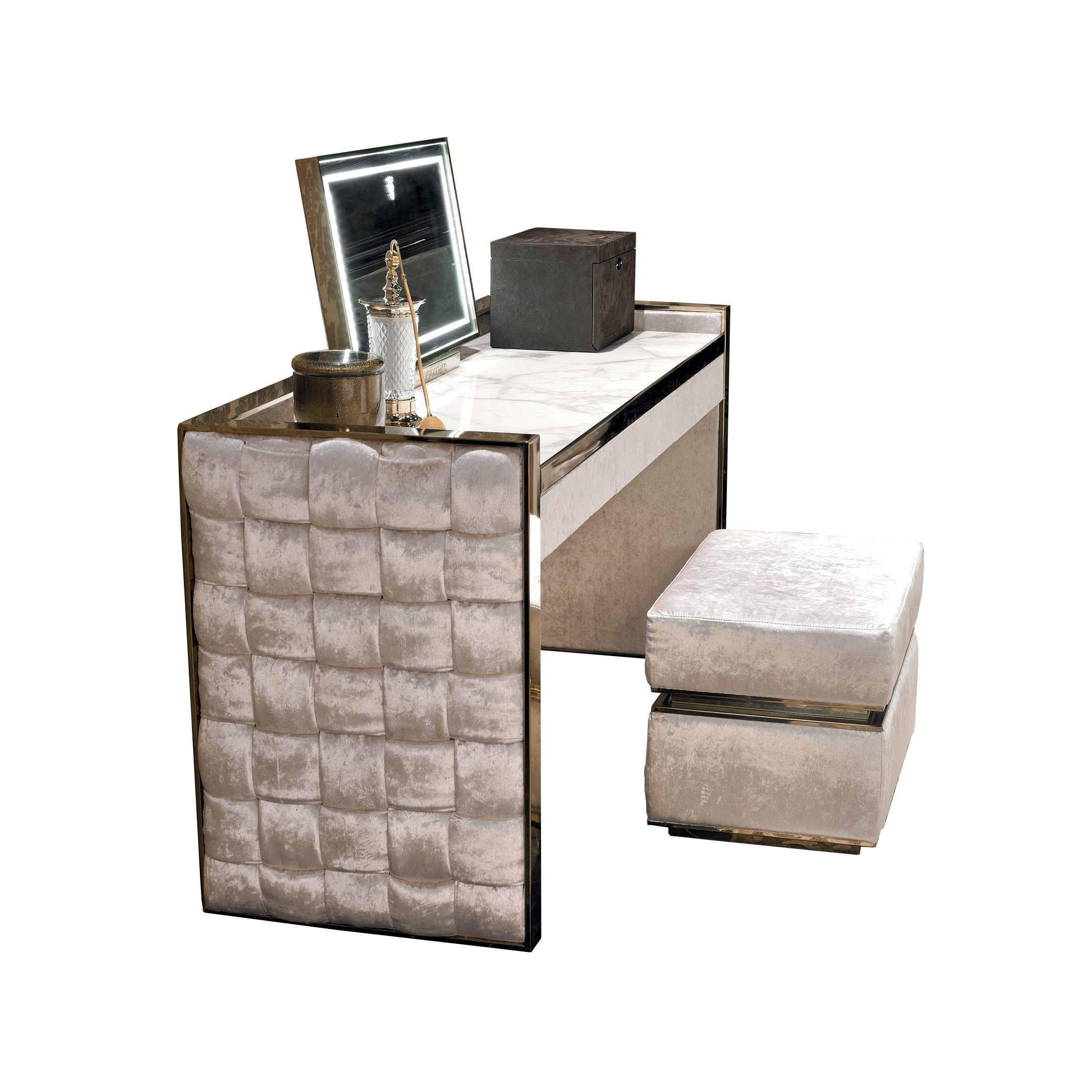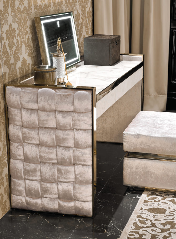 Основна конструкція із сталевих трубчастих труб 60x10 мм. Внутрішня обкладинка з фанерних панелей, оббита і покрита тканиною або шкірою. Зовнішні боки обтягнуті шкірою або тканиною із скрученим малюнком. Вбудований верх із мармуру з 3 ящиками. Верхнє дзеркало з периметром зі сталі; сатинована рама та герб Visionnaire зі світлодіодним підсвічуванням. Металеві деталі можуть бути лаковані в будь-який колір, що входить до вибору металевої обробки.Характеристики