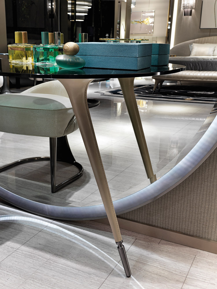 Тумбочка з висувним блоком та верхом у кришталі 12 мм. Структура з фанери та МДФ із висувними ящиками, покритими шпоном та внутрішніми деталями, покритими лаком (кольори RAL). Верхня та зовнішня сторони блоку ящиків покриті тканою шкірою з гладкими краями. Плінтуси та межі ящиків із сатинованої нержавіючої сталі. Верх із загартованого скла (надзвичайно прозоре / бронзове / копчене), дерев'яна ніжка, обтягнута шкірою, з наконечниками з сатинованої нержавіючої сталі. Доступні покриття для передніх ящиків та внутрішньої сторони включені в обробку шпону. Металеві деталі доступні у виборі сатинованого металу. У поєднанні з дзеркалом WESTLEY з підсвічуванням.Характеристики