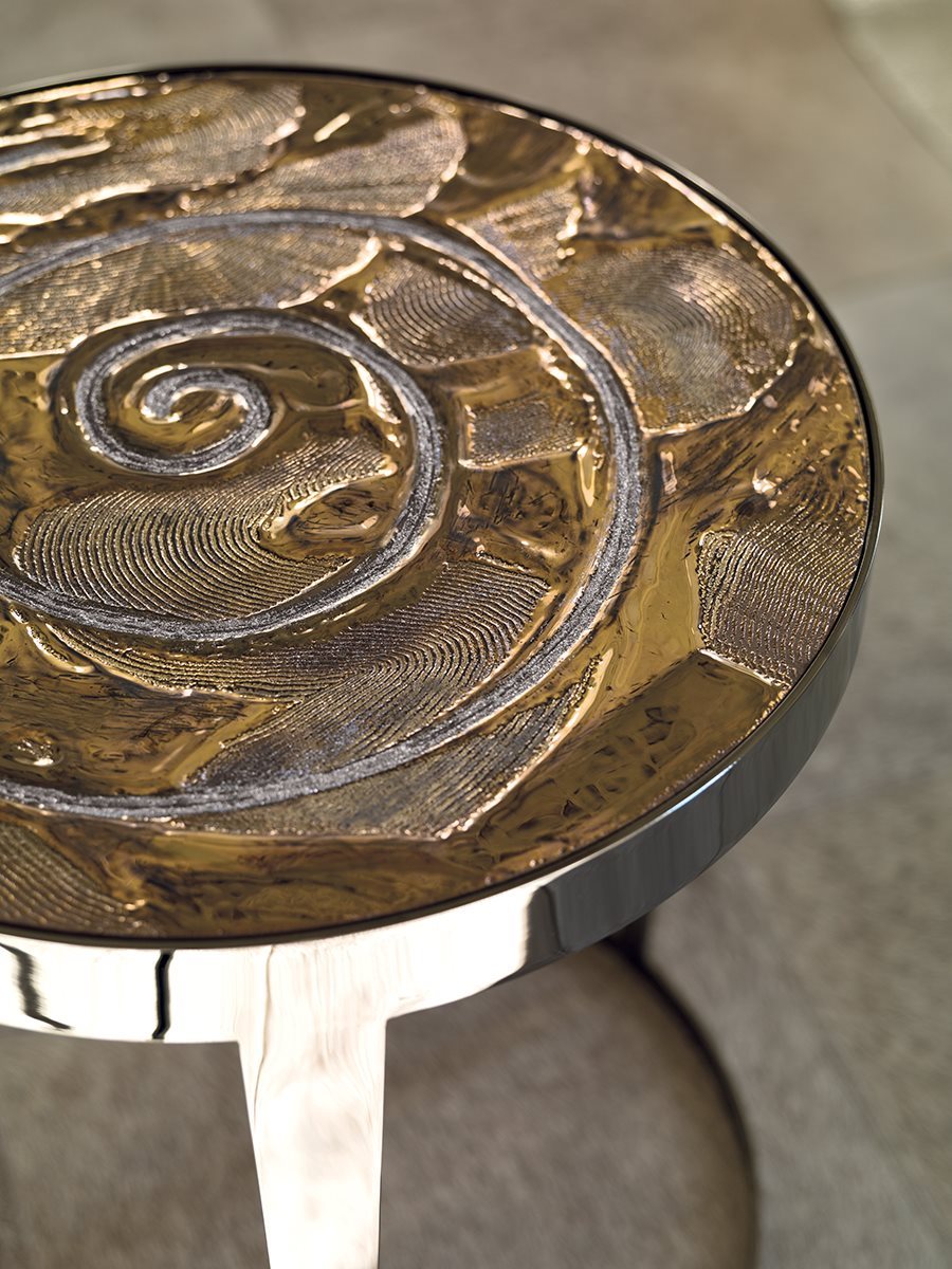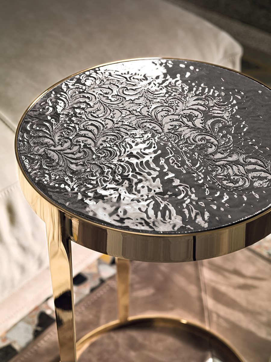 Невеликий столик з лазерного різаного шліфованого металу. Оздоблення рами: золото чорного троянди, яскраво затінене коричневе, яскраве світле золото, матове шампанське золото, яскравий хром, яскраво-чорний хром, матова атласна бронза, яскраво-рожеве золото, матове рожеве золото. Верхнє оздоблення: - керамічне, глянсове лаковане дерево в діапазоні кольорів, глянцевий / матовий чорний дерево, глянцевий / матовий горіх Canaletto, глянсовий / матовий фрісе з явору, пофарбований у чорний кришталь 8 мм зі скосом, бронзове або димчасте дзеркало 6 мм зі скосом, мармур Sahara Noir (поліефірне покриття), білий мармур Dover, мармур Panda White, мармур Green Guatemala, мармур Corteccia, мармур Port Saint Laurent, мармур Red Levanto, мармур Bardiglio Nuvolato, елегантний коричневий мармур, мармур Shale Rosewood, темний мармур Emperador, мармур Silver Wave, агата Чорний мармур, мармур Frappuccino, золотий мармур Calacatta, мармур Fusion Light, мармур Patagonia, мармур Explosion Blu, мармур Fusion Multicolor, мармур кварцовий Джульєтта, мармур Calcite Azul, червоний онікс, онікс із слонової кістки.Характеристики