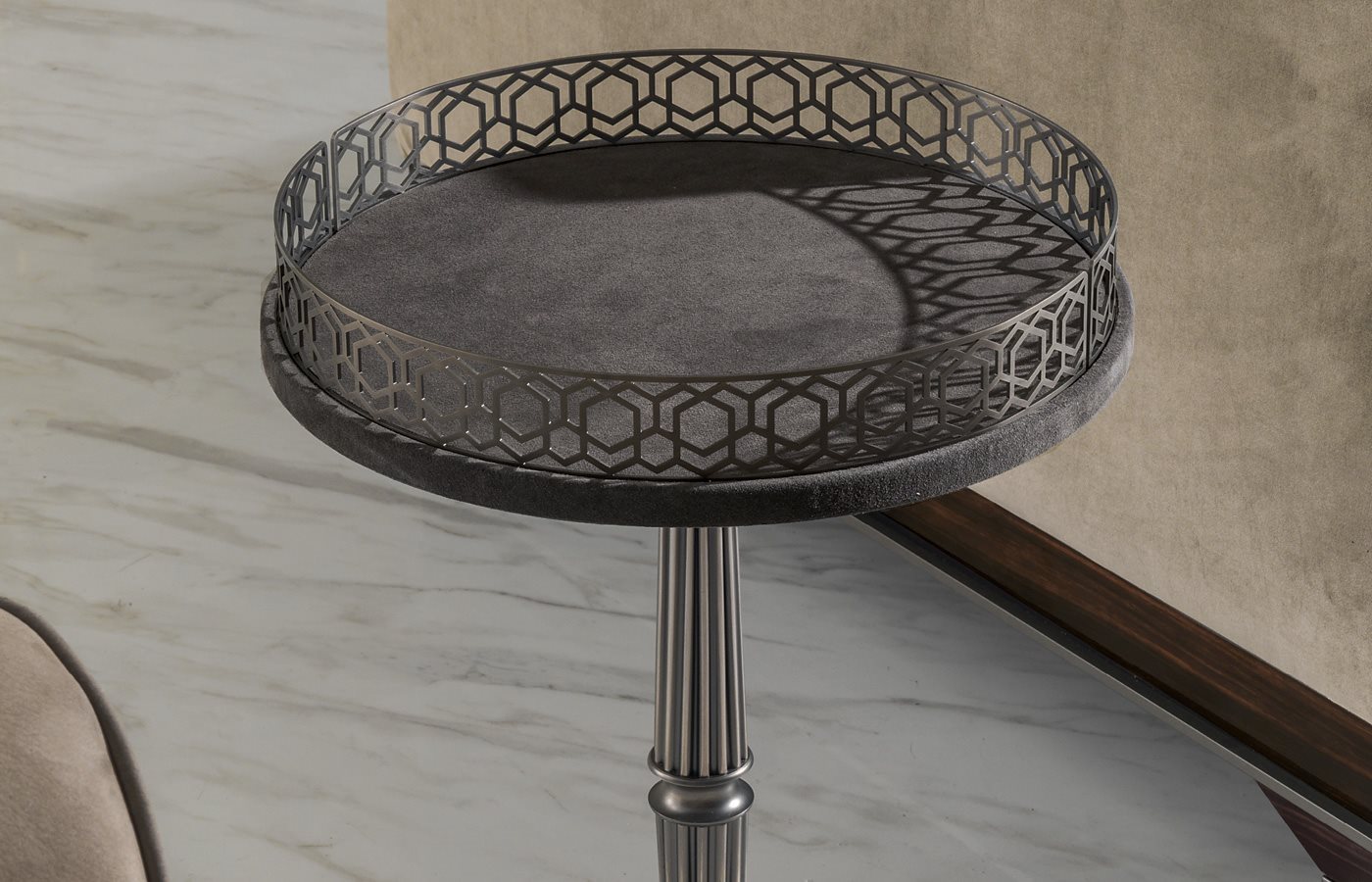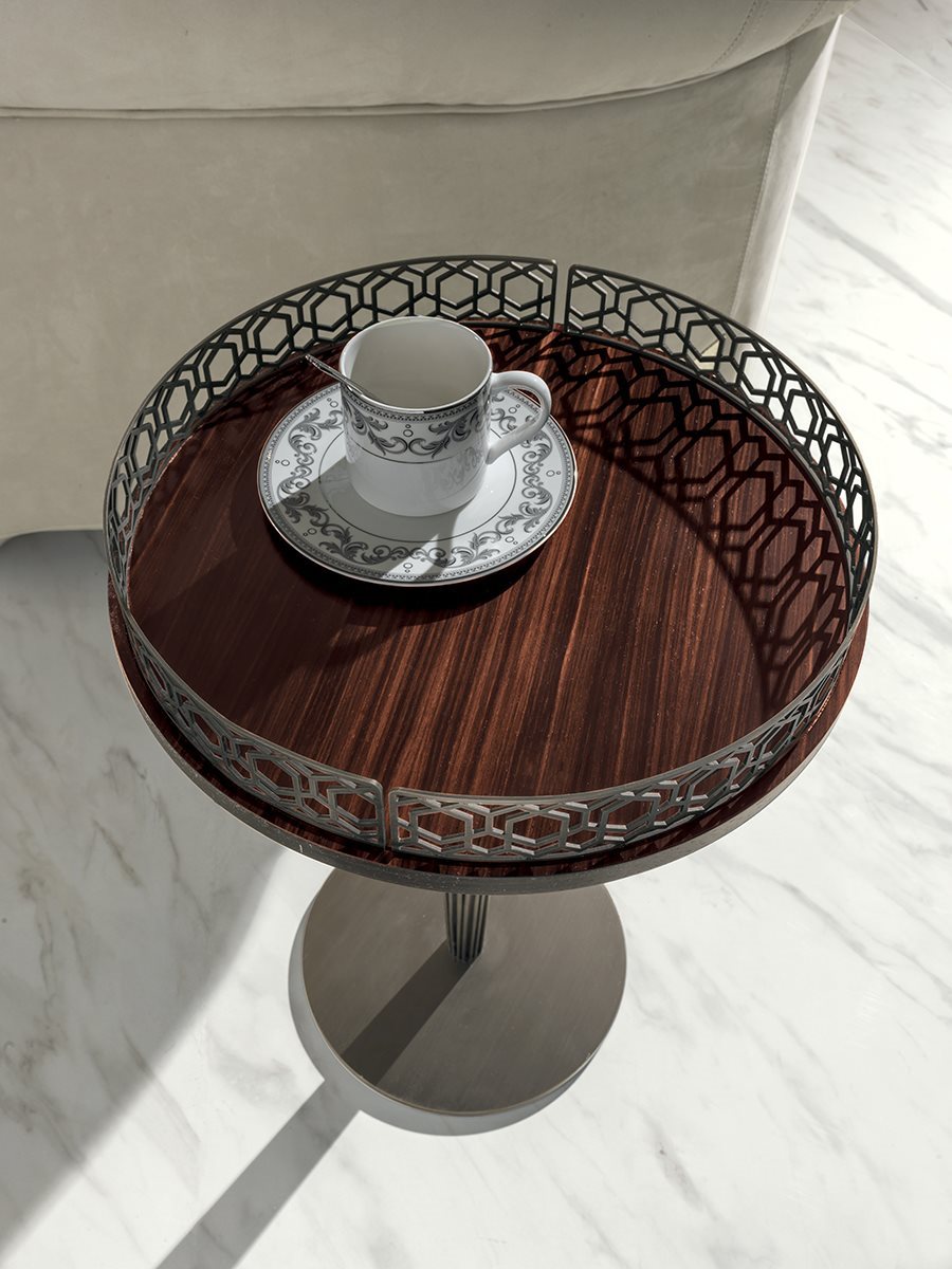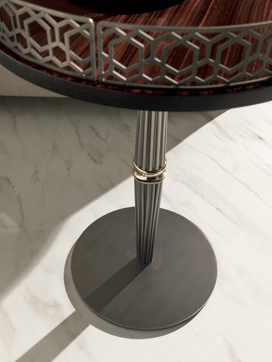 Невеликі столи доступні у двох версіях з різними вершинами. 1 - з фасонною вершиною з мармуру товщиною 20 мм: мармур Azul Macauba, мармур Portoro, мармур Sahara Noir (поліефірне покриття), білий мармур Dover, білий мармур Panda, зелений мармур Гватемали, мармур Corteccia, мармур Port Saint Laurent, мармур Red Levanto Мармур Бардільо Нуволато, Елегантний коричневий мармур, Мармуровий сланцевий палисандр, Темний мармур Emperador, Мармур Срібної хвилі, Чорний мармур Агати, Мармур Фрапучіно, Калакатта Золотий мармур, Мармур Fusion Light, Мармур Патагонія, Вибух Блю, Мармур Fusion Multicolor, Жюльєтський кварцовий мармур Кальцитовий азульський мармур. 2 - з верхом у глянсовому / матовому чорному дереві, матовому волоському горісі Canaletto або покритий шкірою, як у нашому наборі з круглою металевою оправою з лазерним вирізом “Sequence” у наступній обробці: золото чорної троянди, яскраво затінене коричневе, яскраве світле золото , матове шампанське золото, яскравий хром, яскраво-чорний хром, матова атласна бронза, яскраво-рожеве золото, матове рожеве золото. Центральна колонка доступна у трьох варіантах: 1 - все в металі, як основа, 2 - повністю покритий шкірою, як у нашому зразку, 3 - повністю покритий шкірою, як у нашому зразку, з точеним металевим кільцем у тому ж обробці, що і основа. Кругла основа, доступна в обробці: золото Black Rose, яскраво відтінене коричневе, яскраве світле золото, матове шампанське золото, яскравий хром, яскраво-чорний хром, матова атласна бронза, яскраво-рожеве золото, матове рожеве золото. покриті шкірою, як у нашому зразку.Характеристики