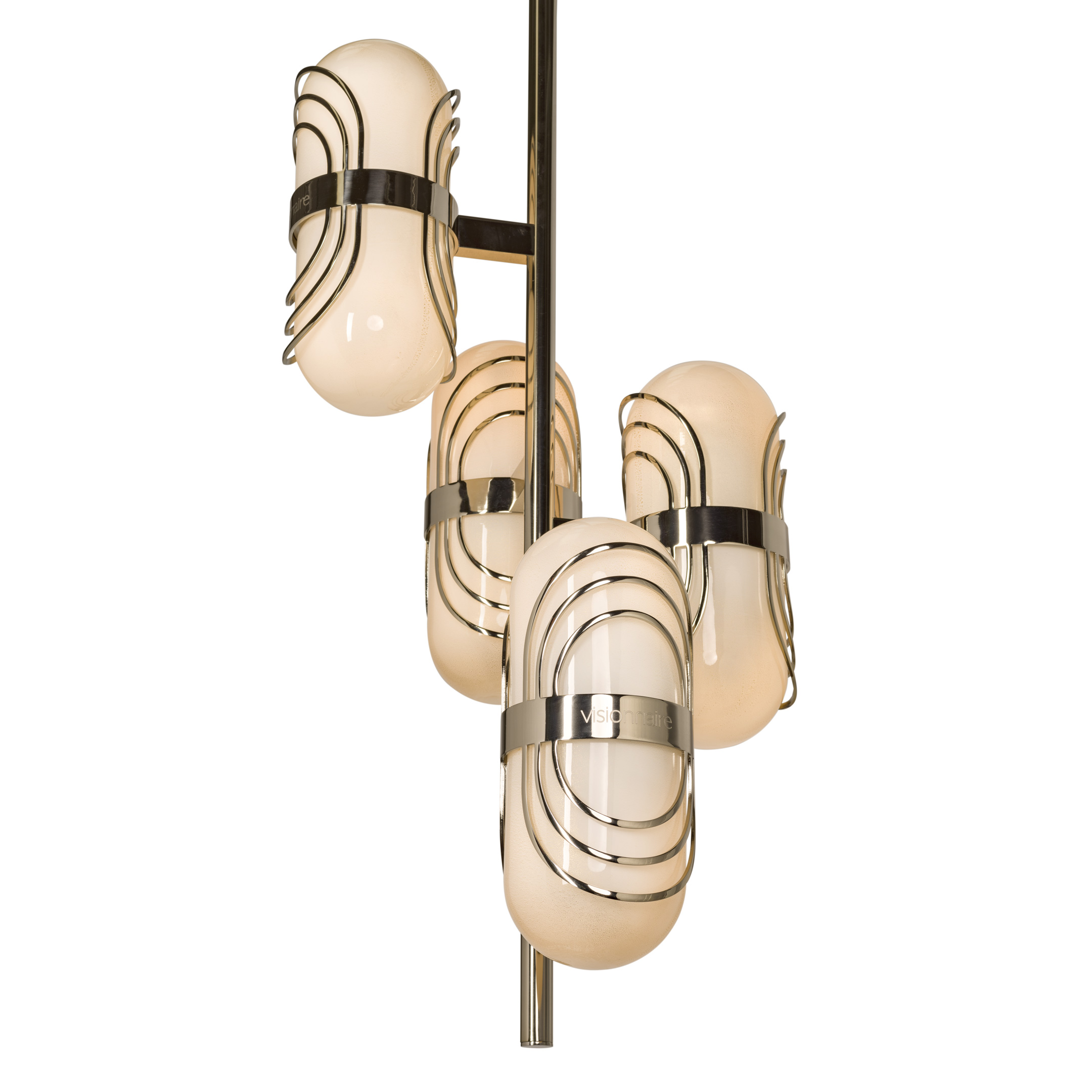 Структура з латуні та сталі, доступна з 4 або 6 легкими елементами у видувному склі, що містить частинки золотого листя, укладені в металевий браслет. Стебло та стельова чашка зі сталі. Система освітлення складається з 8 світлодіодних лампочок E14 макс. 10 Вт кожна, вагою 22 кг (версія з 4 елементами); 12 світлодіодних лампочок E14 макс. 10 Вт кожна, вага 36 кг (версія з 6 елементами). Металеві деталі можуть бути лаковані будь-яким кольором, що вибирається з полірованої металевої обробки.Характеристики