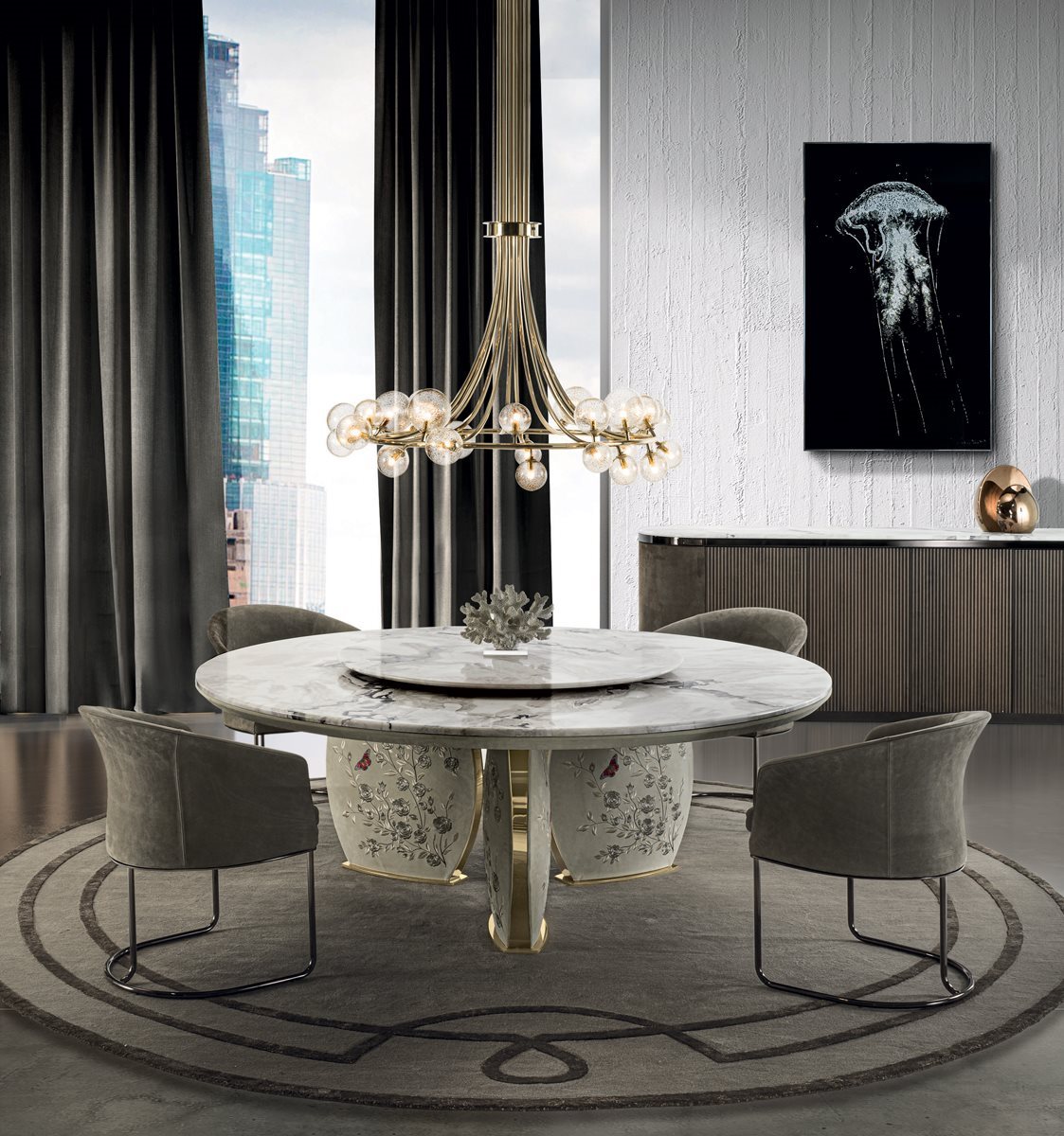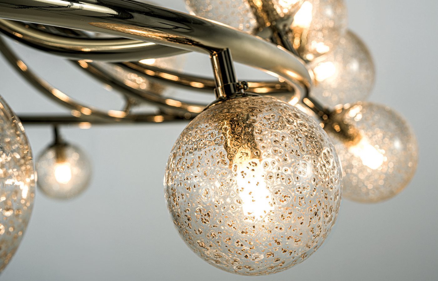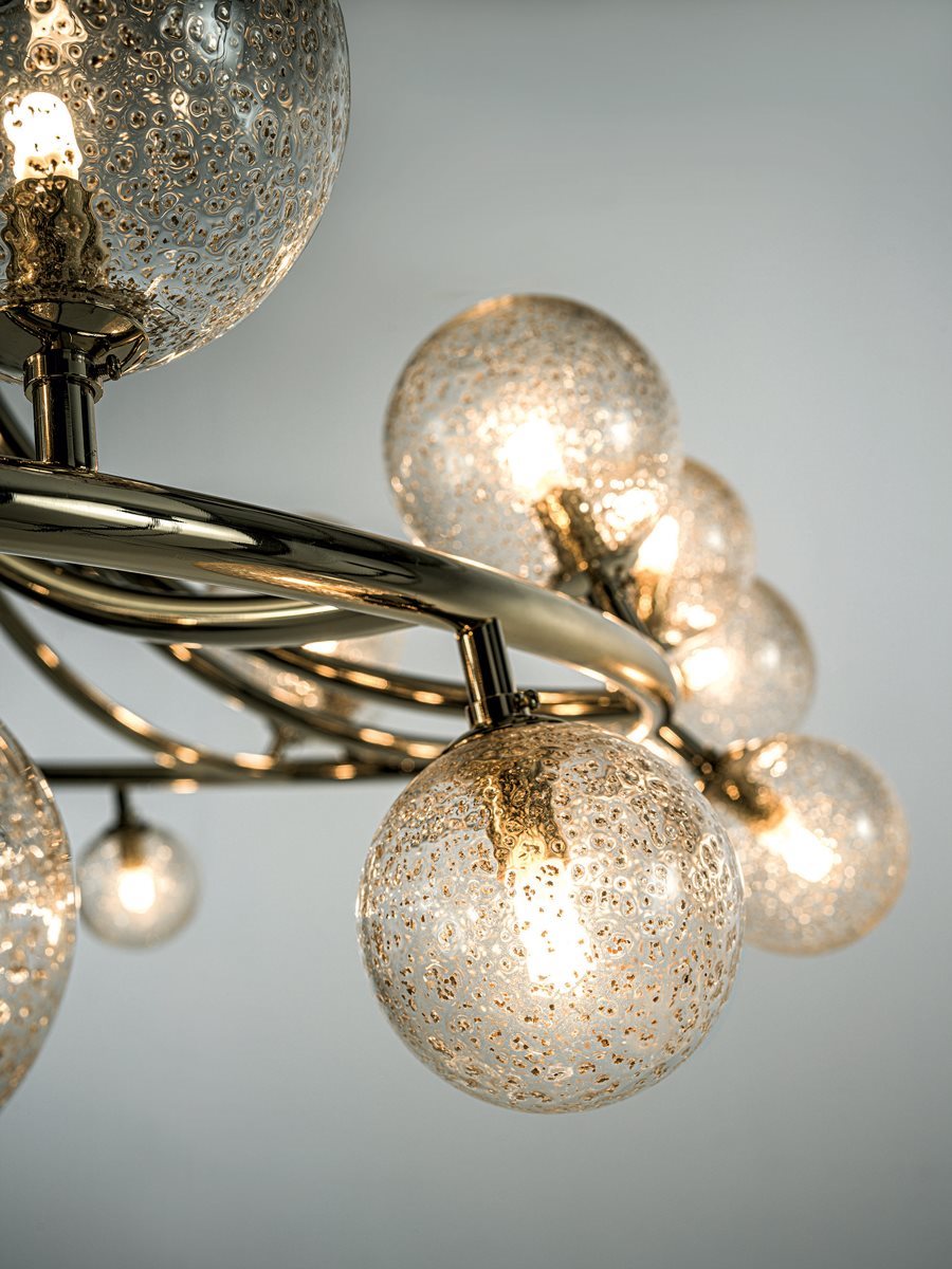 Колекція світильників круглої та овальної форм, підвісних та настінних форматів, з металевими конструкціями в гальванічному оздобленні світле золото та чорний нікель. Видувні скляні кулі різних розмірів із вставками із золотої слюди та латунного пилу. Джерело світла в комплекті: G9 LED 3W - 3000K 260 Lm - регульований затемненням. Примітка: світло-золота конструкція кріпить виключно скляні кулі із золотими вставками, а чорна нікелева конструкція кріпить виключно скляні кулі з латунним порошком.Характеристики