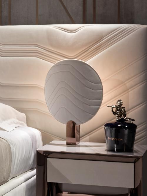 Одна легка настільна лампа з полірованою або атласною металевою основою, із увігнутим віялом у формі віяла з тканини або шкіри (доступна також з вишивкою „Ca“ Foscari). Лампотримач із точеної латуні та лампочка G9 40W зі скляним дифузором. Металеві деталі доступні у виборі обробки металу.Характеристики