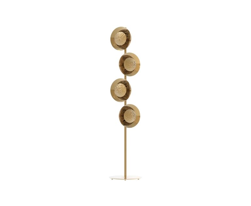 Світло для підлоги Eclipse ручної роботи названо на честь явищ сонячного затемнення. Коли Місяць повільно починає обертатися до точки, яка майже вирівнюється із Сонцем і Землею, Місяць створює тінь, яка частково перешкоджає видимій сонячних променів із землі. Відтворюючи це природне диво, золотистий торшер Eclipse складається з двох округлих латунних пластин, розташованих один перед одним, з невеликою відстанню між ними, дозволяючи лише просвічувати маленьким півмісяцям світла. Лицьова пластина забивається вручну за допомогою сучасної техніки ручної роботи, яка відображається в блискучій позолоченій пластині ззаду. Розкішний відтінок ідеально підходить для коридору, спальні, вітальні або їдальні, поєднуючи сучасні, сучасні та сучасні стилі середини століття. Це тепле світло приносить спокійну та розслаблюючу атмосферу.Характеристики